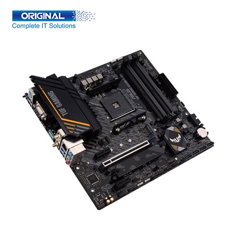 Asus TUF GAMING B550M-E WIFI AMD Micro ATX Motherboard. The Motherboard Model is TUF GAMING B550M-E WIFI. The Brand Asus. Supported Processor AMD Ryzen 5000 Series/ 5000 G-Series/ 4000 G-Series/ 3000 Series Desktop Processors. Chipset AMD B550. Socket AM4. BIOS 256 Mb Flash ROM, UEFI AMI BIOS. Form Factor microATX: 24.4cm x 24.4cm. Memory Types DDR4, Dual Channel, 4 x DIMM. Maximum Memory 128 GB. Graphics 1 x DisplayPort 1.2, 1 x D-Sub, 1 x HDMI 2.1 (4K@60Hz). PCI AMD Ryzen™ 5000 Series/ 3000 Series Desktop Processors: 1 x PCIe 4.0 x16 slot (supports x16 mode). AMD Ryzen™ 5000 G-Series/ 4000 G-Series Desktop Processors: 1 x PCIe 3.0 x16 slot (supports x16 mode). AMD B550 Chipset: 2 x PCIe 3.0 x1 slots. M.2 AMD Ryzen™ 5000 Series/ 3000 Series Desktop Processors: M.2_1 slot (Key M), type 2242/2260/2280 (supports PCIe 4.0 x4 & SATA modes). AMD Ryzen™ 4000 G-Series Desktop Processors: M.2_1 slot (Key M), type 2242/2260/2280 (supports PCIe 3.0 x4 & SATA modes). AMD B550 Chipset: M.2_2 slot (Key M), type 2242/2260/2280 (supports PCIe 3.0 x4 & SATA modes). 4 x SATA 6Gb/s ports. Support RAID 0, 1, 10. 1 x PS/2 Keyboard/Mouse combo port. 2 x USB 3.2 Gen 2 ports (2 x Type-A), 2 x USB 3.2 Gen 1 port (2 x Type-A), 2 x USB 2.0 ports (2 x Type-A), 1 x USB 3.2 Gen 1 connector (supports USB Type C®), 1 x USB 3.2 Gen 1 header supports additional 2 USB 3.2 Gen 1 port, 2 x USB 2.0 headers support additional 4 USB 2.0 ports, 2 x USB 3.2 Gen 2 ports (2 x Type-A), 2 x USB 3.2 Gen 1 port (2 x Type-A), 2 x USB 2.0 ports (2 x Type-A). LAN Port TUF LAN Guard. 1 x Realtek 1Gb Ethernet port. 1 x HDMI™ port. 1 x D-Sub port. 1 x DisplayPort. 3 x Audio jacks. 1 x BIOS FlashBack™ button. 1 x ASUS Wi-Fi Module. 2x2 Wi-Fi 6 (802.11 a/b/g/n/ac/ax) + BT5.1. Bluetooth v5.1 function will be ready in Windows 10 build 19041 or later. Supported Operating System Windows 10 64-bit. Asus TUF GAMING B550M-E WIFI AMD Micro ATX Motherboard comes with 03 years warranty.