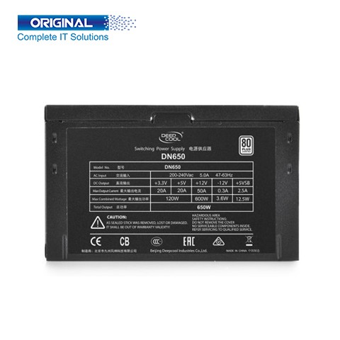 Deepcool DN650 EN 650W 80 Plus Gold Power Supply. The Model is Deepcool DN650 EN. The brand is Deepcool. This Power Supply Capacity is 650W. Its Color is Black. It has no RGB Fan. Deepcool Power Supply supports Intel Form Factor ATX 12V V2.4, Active PFC. Deepcool 650W Power Supply gives Input Voltage 100-240V, Input Current 5A, Input Frequency 47~63Hz, Power Good Signal 650 Watt, MTBF 100,000 hours, Cooling Fan System 120mm Silent Fan. Its ATX 20+4 Pin x 1, CPU 4+4 Pin x 1, PCI-e 6+2 Pin x 2, SATA x 5 4 Pin, Peripheral x 3. The Power Supply Dimensions are 150×140×86mm (W x L x H). Deepcool DN650 EN 650W 80 Plus Power Supply has three years warranty.