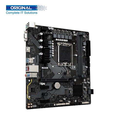 Gigabyte B760M D2H DDR4 13th and 12th Gen Motherboard. The model is B760M D2H DDR4. The brand is Gigabyte—the Motherboard Support for the 13th and 12th Generation Intel® Core™, Pentium® Gold, and Celeron® Processors. L3 cache varies with the CPU. Intel® B760 Express Chipset. Socket LGA1700. 1 x 128 Mbit flash. Use of licensed AMI UEFI BIOS. PnP 1.0a, DMI 2.7, WfM 2.0, SM BIOS 2.7, ACPI 5.0. Micro ATX Form Factor; 24.4cm x 24.4cm. Memory Dual Channel DDR4 2 x DIMM. Maximum Memory up to 64GB (32 GB single DIMM capacity). 1 x PCI Express x16 slot, supporting PCIe 4.0 and running at x16. 2 x PCI Express x1 slots, supporting PCIe 3.0 and running at x1. 4 x SATA 6Gb/s connectors. RAID 0, RAID 1, RAID 5, and RAID 10 support SATA storage devices. Port 1 x PS/2 keyboard/mouse port. 6 x USB 3.2 Gen 1 ports (4 ports on the back panel, 2 ports available through the internal USB header). 4 x USB 2.0/1.1 ports (2 ports on the back panel, 2 ports available through the internal USB header). 4 x USB 2.0/1.1 ports are available through the internal USB headers. 1 x HDMI port. 1 x D-Sub port. 1 x RJ-45 port. Realtek® 2.5GbE LAN chip (2.5 Gbps/1 Gbps/100 Mbps). 3 x audio jacks. Intel® Wi-Fi 6E AX210. WIFI a, b, g, n, ac, ax, supporting 2.4/5/6 GHz carrier frequency bands. BLUETOOTH 5.3. Support for 11ax 160MHz wireless standard and up to 2.4 Gbps data rate. They supported Operating System Support for Windows 11 64-bit & Support for Windows 10 64-bit. The Gigabyte B760M D2H DDR4 13th and 12th Gen Motherboard comes with 03 years warranty.
