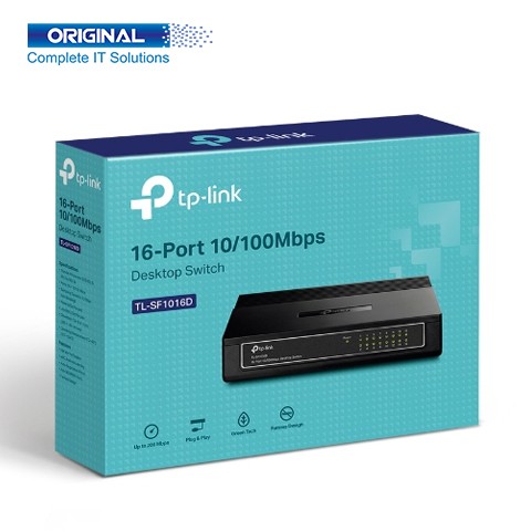 TP-Link TL-SF1016D 16-Port Desktop Switch. Model TL-SF1016D, and TP-Link brand. TP-Link TL-SF1016D 16-Port Type Desktop Switch, Port 16 Port, Interface 16× 10/100 Mbps RJ45 Ports AUTO Negotiation/AUTO MDI/MDIX, External Power Supply External Power Adapter(Output 5.0VDC / 0.6A), Max Power Consumption 3.2W, Max Heat Dissipation 11.0 BTU/h. This TL-SF1016D 16-Port Desktop Switch Dimensions 5.6 x 1.6 in (200 x 142 x 40 mm), Environment Operating Temperature 0℃~40℃ -40℃~60℃, Storage Temperature -40℃~60℃, Operating Humidity 10%~90% non-condensing, Storage Humidity 5%~90% non-condensing. TL-SF1016D 16-Port Desktop Switch 01 Years Warranty.