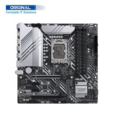 Asus Prime Z690M-PLUS D4 12th Gen Micro ATX Motherboard. Support for 13th Gen Intel® Core™ Processors & 12th Gen Intel® Core™, Pentium® Gold and Celeron® Processors. Intel® Z690 Chipset. Socket LGA1700. Form Factor mATX; 9.6 inch x 9.6 inch (24.4 cm x 24.4 cm). Asus Prime Z690M-PLUS D4 Memory Types DDR4, Dual-Channel. Slot 4 x DIMM. Support for DDR4 5333(OC)/ 5133(OC)/ 5000(OC)/ 4800(OC)/ 4600(OC)/ 4400(OC)/ 4266(OC)/ 4133(OC)/ 4000(OC)/ 3866(OC)/ 3733(OC)/ 3600(OC)/ 3466(OC)/ 3400(OC)/ 3333(OC)/ 3200/ 3000/ 2933/ 2800/ 2666/ 2400/ 2133 Non-ECC, Un-buffered Memory. Maximum Memory 128 GB. Graphics is 1 x DisplayPort (Supports max. 8K@60Hz as specified in DisplayPort 1.4), and 1 x HDMI port (Supports 4K@60Hz as specified in HDMI 2.1). PCI is Intel® 13th & 12th Gen Processors: 1 x PCIe 5.0/4.0/3.0 x16 slot, Intel® Z690 Chipset: 1 x PCIe 4.0/3.0 x16 slot (supports x4 mode), 2 x PCIe 3.0 x1 slots. Storage Supports 3 x M.2 slots, 4 x SATA 6Gb/s ports. USB Port is Rear USB (Total 8 ports): 1 x USB 3.2 Gen 2x2 port (1 x USB Type-C®), 1 x USB 3.2 Gen 2 port (1 x Type-A), 4 x USB 3.2 Gen 1 ports (4 x Type-A), 2 x USB 2.0 ports (2 x Type-A), Front USB (Total 7 ports): 1 x USB 3.2 Gen 1 connector (supports USB Type-C®), 1 x USB 3.2 Gen 1 header supports additional 2 USB 3.2 Gen 1 ports, 2 x USB 2.0 headers support additional 4 USB 2.0 ports, Display Port is 1 x DisplayPort, HDMI Port is 1 x HDMI port, LAN Port is 1 x Intel 1Gb Ethernet, Audio Port is 5 x Audio jacks. Supported Operating System Support for Windows® 11, and Windows® 10 64-bit. Asus Prime Z690M-PLUS D4 12th Gen Micro ATX Motherboard has Three years warranty.