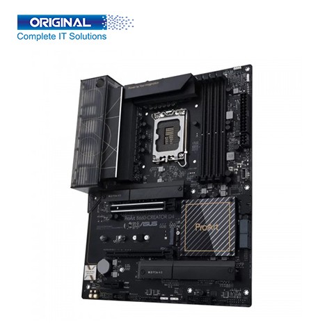 ASUS ProArt B660-CREATOR D4 12th Gen ATX Motherboard. Support for 13th Gen Intel® Core™ Processors & 12th Gen Intel® Core™, Pentium® Gold and Celeron® Processors. Intel® B660 Chipset. Socket LGA1700. Form Factor ATX; 12 inch x 9.6 inches ( 30.5 cm x 24.4 cm ). Asus ProArt B660-CREATOR D4 Memory Types DDR4, Dual-Channel. Slot 4 x DIMM. Support for DDR4 5333(OC)/ 5066(OC)/ 5000(OC)/ 4800(OC)/ 4600(OC)/ 4400(OC)/ 4266(OC)/ 4000(OC)/ 3866(OC)/ 3733(OC)/ 3600(OC)/ 3466(OC)/ 3400(OC)/ 3333(OC)/ 3200/ 3000/ 2933/ 2800/ 2666/ 2400/ 2133 Non-ECC, Un-buffered Memory. Maximum Memory 128 GB. Graphics is 1 x HDMI port (Support 4K@60Hz as specified in HDMI 2.1.), 1 x USB Type-C port that supports DisplayPort output, and 1 x DP IN that will have output through USB Type-C port. PCI is Intel® 13th & 12th Gen Processors: 1 x PCIe 5.0/4.0/3.0 x16 slot, Intel® B660 Chipset: 1 x PCIe 3.0 x16 slot (supports x4 mode), 1 x PCIe 3.0 x1 slot. Storage Supports 3 x M.2 slots, 4 x SATA 6Gb/s ports. USB Port is Rear USB (Total 9 ports): 1 x USB 3.2 Gen 2 Type-C® port (shared with DisplayPort graphic output), 4 x USB 3.2 Gen 1 ports (4 x Type-A), 4 x USB 2.0 ports (4 x Type-A), Front USB (Total 7 ports): 1 x USB 3.2 Gen 2x2 connector (supports USB Type-C® with 60W PD/QC4+), 1 x USB 3.2 Gen 1 header supports additional 2 x USB 3.2 Gen1 ports, 2 x USB 2.0 headers support additional 4 USB 2.0 ports, Display Port is 1 x DisplayPort (Input only), HDMI Port is 1 x HDMI port, LAN Port is 1 x Intel® 2.5Gb Ethernet, Audio Port is 5 x Audio jacks. Supported Operating System Support for Windows® 11, and Windows® 10 64-bit. ASUS ProArt B660-CREATOR D4 12th Gen ATX Motherboard has Three years warranty.