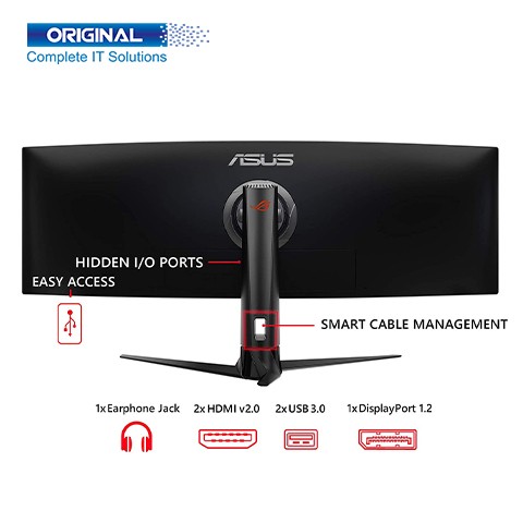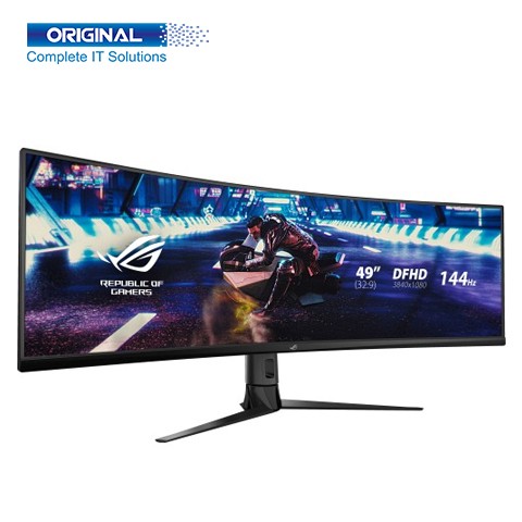 Asus ROG Strix XG49VQ 49 Inch Full HD 4K Gaming Monitor. The Model is XG49VQ. The brand is ASUS. The Display Type is VA. The Monitor Display size is 49 Inches. Its Screen Resolution 3840x1080, Brightness 450cd/㎡, Aspect Ratio 32:9, Contrast Ratio 3000:1, Response Time 4ms(GTG), Refresh Rate 144Hz, Viewing Angle 178°(H)/178°(V), Color Support 1.07 Billion. It has included many ports such as HDMI(v2.0) x 2, DisplayPort 1.2 x 1, USB Port Yes(2 ports USB 3.0), Speaker (Build-in) Yes(5Wx2), and Audio Jack Yes. It provides a Power Requirement of <47W and Power Consumption of 100-240V, 50/60Hz. Dimensions (W x D x H) 1308 x 484 x 370 mm and Weight 20.9 Kg. Asus ROG Strix XG49VQ 49 Inch Full HD 4K Gaming Monitor has three years warranty.