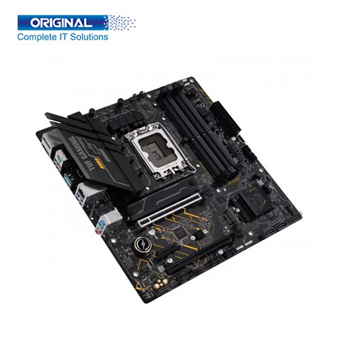ASUS TUF Gaming B660M-E D4 12th Gen mATX Motherboard. Support for 13th Gen Intel® Core™ & 12th Gen Intel® Core™, Pentium® Gold and Celeron® Processors. Intel® B660 Chipset. Socket LGA1700. Form Factor mATX; 9.6 inch x 9.6 inch ( 24.4 cm x 24.4 cm ). Asus TUF Gaming B660M-E D4 Memory Types DDR4, Dual-Channel. Slot 4 x DIMM. Supported Bus Speed Support for DDR4 5333(OC)/ 5000(OC)/ 4800(OC)/ 4600(OC)/4400(OC)/ 4266(OC)/ 4000(OC)/ 3733(OC)/ 3600(OC)/ 3466(OC)/ 3400(OC)/ 3333(OC)/ 3200/ 3000/ 2933/ 2800/ 2666/ 2400/2133 Non-ECC, Un-buffered Memory, Maximum Memory 128 GB. Graphics is 1 x DisplayPort, and 1 x HDMI®port. PCI is Intel®13th & 12th Gen Processors: 1 x PCIe 4.0/3.0 x16 slot, Intel® B660 Chipset: 1 x PCIe 3.0 x16 slot (supports x4 mode), 1 x PCIe 3.0 x1 slot. Storage is 2 x M.2 slots, 4 x SATA 6Gb/s ports. PS/2 Port is 1 x PS/2 Keyboard/Mouse combo port, USB Port is Rear USB (Total 6 ports): 2 x USB 3.2 Gen 2 ports (Type-A), 2 x USB 3.2 Gen1 ports (Type-A), 2 x USB 2.0 ports (2 x Type-A), Front USB (Total 7 ports): 1 x USB 3.2 Gen 2 connector (supports USB Type-C®), 1 x USB 3.2 Gen 1 header supports additional 2 USB 3.2 Gen 1 ports, 2 x USB 2.0 headers support additional 4 USB 2.0 ports, Display Port is 1 x DisplayPort, HDMI Port is 1 x HDMI port, LAN Port is 1 x Intel® 2.5Gb Ethernet, Audio Port is 3 x Audio jacks. Supported Operating System Support for Windows® 11, and Windows® 10 64-bit. ASUS TUF Gaming B660M-E D4 12th Gen mATX Motherboard has Three years warranty.