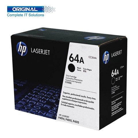 HP 64A Black Original LaserJet Toner. The color of the Print Toner is Black, and the Print Technology is Laser. This HP 64A Black Toner Page Yield is 10,000 Pages, Part Number is CC364A. Its Supported Printers are HP LaserJet P4015, P4014, and P4515. Its HP 64A Black Original LaserJet Toner Dimensions (W x D x H) are 15.39 x 7.60 x 11.81 in and its weight is 5.43 lb.