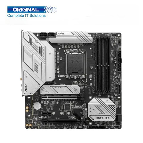 MSI MAG B760M MORTAR WIFI DDR5 12th & 13th Gen mATX Motherboard. This Model is MSI MAG B760M MORTAR WIFI DDR5, Brand MSI, Supported Processor 12th Gen Intel Core, Pentium Gold And Celeron Processors, Chipset Intel B660 Chipset, Socket LGA1700, Form Factor mATX, 243.84mmx243.84mm, Memory Types DDR5, Channel Dual-Channel, Slot 4x DDR5, Supported Bus Speed Support 7000+(OC)/ 6800(OC)/ 6600(OC)/ 6400(OC)/ 6200(OC)/ 6000(OC)/ 5800(OC)/ 5600(JEDEC)/ 5400(JEDEC)/ 5200(JEDEC)/ 5000(JEDEC)/ 4800(JEDEC) MHz, Max. verclocking frequency: • 1DPC 1R Max speed up to 7000+ MHz, • 1DPC 2R Max speed up to 6600+ MHz, • 2DPC 1R Max speed up to 6400+ MHz, • 2DPC 2R Max speed up to 5600+ MHz, Maximum Memory 192GB, Graphics 1x HDMI, Support HDMITM 2.1 with HDR, maximum resolution of 4K 60Hz* Support DP 1.4, the maximum resolution of 4K 60Hz, PCI 2x PCI-E x16 slot, Supports x16/x4, 1x PCI-E x1 slot, CI_E1 Gen PCIe 5.0 supports up to x16 (From CPU), PCI_E2 Gen PCIe 3.0 supports up to x1 (From Chipset), PCI_E3 Gen PCIe 4.0 supports up to x4 (From Chipset), M.2 2x M.2 M.2_1 Source (From CPU) supports up to PCIe 4.0 x4 , supports, 2280/2260/2242 devices, M.2_2 Source (From Chipset) supports up to PCIe 4.0 x4 / SATA mode, supports 2280/2260/2242 devices, Internal Connectors 1x Power Connector(ATX_PWR), 2x Power Connector(CPU_PWR), 1x CPU Fan, 1x Pump Fan, 4x System Fan, 2x Front Panel (JFP), 1x Chassis Intrusion (JCI), 1x Front Audio (JAUD), 1x TBT connector (JTBT, supports RTD3), 1x Tuning Controller connector(JDASH), 2x Addressable V2 RGB LED connector (JARGB_V2), 1x RGB LED connector(JRGB), 4x USB 2.0 ports, 2x USB 3.2 Gen1 Type A ports, 1x USB 3.2 Gen2 Type C ports, USB Port 4x USB 2.0 (Rear), 4x USB 2.0 (Front), 2x USB 3.2 Gen1, ype A (Front), 3x USB 3.2 Gen2 Type A (Rear), 1x USB 3.2 Gen2 Type C (Front), 1x USB 3.2 Gen2x2 Type C (Rear), HDMI Port 1x HDMI, Display Port DisplayPort 1.4, LAN Port Realtek 2.5Gbps LAN, Audio Port 1x Front Audio (JAUD), Optical SPDIF 1x Optical S/PDIF OUT, Wi-Fi / Bluetooth Antenna 1x Wi-Fi / Bluetooth Antenna, WIRELESS / BLUETOOTH Intel® Wi-Fi 6E, The Wireless module is pre-installed in the M.2 (Key-E) slot, Supports MU-MIMO TX/RX, 2.4GHz / 5GHz / 6GHz* (160MHz) up to 2.4Gbps, Supports 802.11 a/ b/ g/ n/ ac/ ax, Supports Bluetooth® 5.3, FIPS, FISMA, Supported OS Support for Windows® 11 64-bit, Windows® 10 64-bit. The MSI MAG B760M MORTAR WIFI DDR5 12th & 13th Gen mATX Motherboard has a 03 Years Warranty.