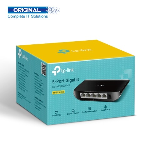 TP-Link TL-SG1005D Gigabit 5-Port Desktop Switch. Model TP-Link TL-SG1005D, and TP-Link brand. TL-SG1005D Gigabit Type Gigabit Switch, Port 5-Port, Network Standard IEEE 802.3x. Interfaces 100/100 RJ45 Ports Auto Negotiation/Auto MDI/MDIX, Power Supply External Power Adapter (Output 9VDC / 0.6A), Power Consumption 2.4W. Gigabit 5-Port Desktop Switch External Power Supply External Power Adapter (Output 5VDC / 0.6A), LED Indicator Power, 1, 2, 3, 4, 5, Max Power Consumption 2.4W. TL-SG1005D Gigabit Max Heat Dissipation 8.2 BTU/h, Dimension 5.5×3.5×0.9 in, (140×88×23 mm). This TL-SG1005D Gigabit Environment Operating Temperature is 0℃~40, 32℉~104℉, Storage Temperature -40℃~60℃ (-40℉~140℉), Operating Humidity 10%~90% non-condensing, Storage Humidity 5%~90% non-condensing. TL-SG1005D Gigabit 5-Port Desktop Switch 01 Years Warranty.