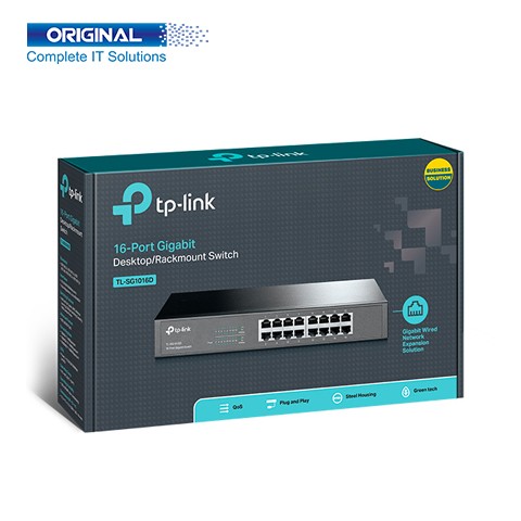 TP-Link TL-SG1016D Gigabit 16-Port Desktop/Rackmount Switch. Model TP-Link TL-SG1016D, and TP-Link brand. This TP-Link TL-SG1016D Gigabit Type Gigabit Switch, Port 16-Port, Network Standard Ieee 802.3i, 802.3u, 802.3AB, 802.3, Interface 16 10\100\1000Mbps Rj 45 Ports, Power Supply 100-240vac, 50\60Hz. TL-SG1016D Gigabit 16-Port Power Consumption Maximum 9.26w, Max Power Consumption 9.95w, Max Heat Dissipation 33.93BTu\h, Dimensions 11.6x7.1x1.7 inch (294x180x44 mm). This TP-Link TL-SG1016D Gigabit 16-Port Operating Temperature 0c~40c (32f~104f), Storage Temperature -40c~70c(-40f~158f), Operating Humidity 10%~90% non-condensing, Storage Humidity 5%~90% non-condensing. TL-SG1016D Gigabit 16-Port Desktop/Rackmount Switch 01 Years Warranty.
