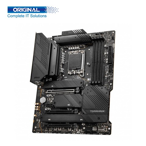 MSI MAG Z690 TOMAHAWK WIFI 12th Gen ATX Motherboard. Supports 12th/ 13th Gen Intel® Core™, Pentium® Gold and Celeron® processors. Intel® Z690 Chipset. Socket LGA1700. Form Factor ATX. MSI MAG Z690 TOMAHAWK WIFI Motherboard Memory Types DDR5 Dual-Channel. Slot 4 x DIMM. Supported Bus Speed 1DPC 1R Max speed up to 6400+ MHz, 1DPC 2R Max speeds up to 6000+ MHz, 2DPC 1R Max speeds up to 6000+ MHz, 2DPC 2R Max speeds up to 5600+ MHz. Maximum Memory 128 GB. Graphics is 1x HDMI 2.1 with HDR port, supports a maximum resolution of 4K 60Hz, 1x DisplayPort 1.4 port with HBR3, supports a maximum resolution of 4K 60Hz. Storage 4x M.2 slots (Key M), 6x SATA 6Gb/s ports (From Z690 chipset), Supports RAID 0, RAID 1, RAID 5, and RAID 10 for SATA storage devices, Supports RAID 0, RAID 1, and RAID 5 for M.2 NVMe storage devices. USB Port is Intel® Z690 Chipset: 1x USB3.2 Gen2x2 20Gbps Type-C port on the back panel, 4x USB 3.2 Gen 2 10Gbps ports (1 Type-C internal connector, 3 Type-A ports on the back panel), 4x USB 3.2 Gen 1 5Gbps ports (2 Type-A ports on the back panel, 2 ports through the internal connector), 1x USB 2.0 Type-A port on the back panel, and Hub-GL850G: 5x USB 2.0 ports (1 Type-A port on the back panel, 4 Type-A ports available through internal connectors), HDMI Port is 1x HDMI 2.1 with HDR port, Display Port is 1x DisplayPort 1.4 port with HBR3, LAN Port is 1x Intel® I225V 2.5Gbps LAN controller, Audio Port is 7.1-Channel High Definition Audio, Supports S/PDIF output. Supported Operating System Support for Windows® 11 64-bit, and Windows® 10 64-bit. MSI MAG Z690 TOMAHAWK WIFI 12th Gen ATX Motherboard has Three years warranty.